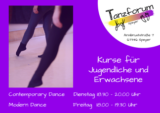 - fortlaufende Tanzkurse in den Bereichen Ballett, Modern Dance und Contemporary Dance für Kinder, Jugendliche und Erwachsene in verschiedenen Niveaustufen (Anfänger, Mittelstufe und Fortgeschrittene) in Ludwigshafen und Speyer